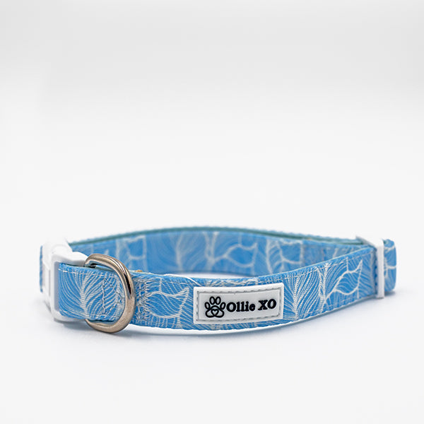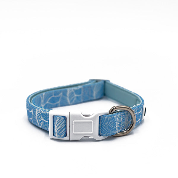 - Accessorize your pup with the Palms Collar. This light blue dog collar is crafted from durable material and features adjustable straps for a comfortable fit. The perfect style for any breed, it will have your dog looking their best.